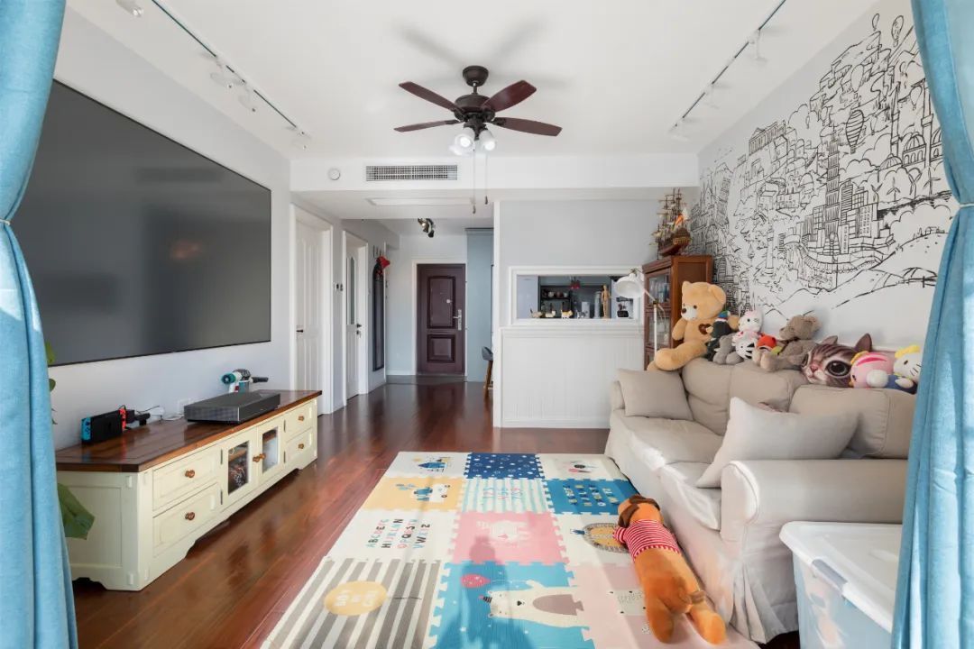 电视墙以乳胶漆为底,悬挂超薄电视机,搭配象牙白木质电视柜,天花则结合导轨灯与风扇灯,营造客厅的端庄雅致氛围。