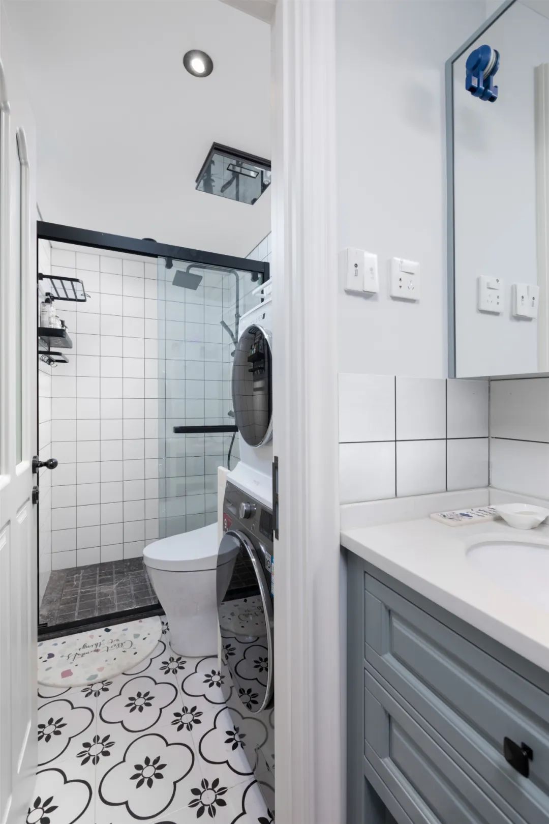 卫生间配置洗衣机与烘干机,梅花砖地面与墙面装饰相得益彰,营造出文艺优雅、自然舒适的卫浴空间。