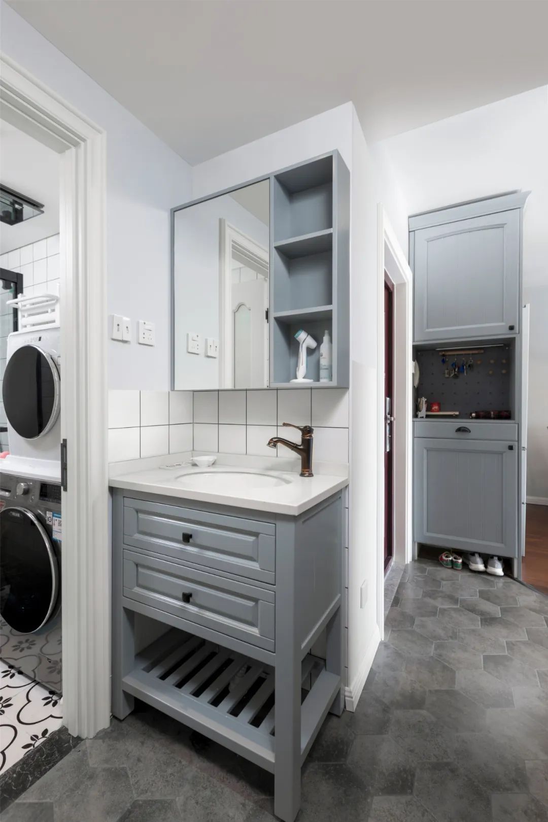 卫生间洗手盆置于过道,银灰浴室柜定制,洗漱体验升级;大门旁鞋柜设计巧妙,中空底部,便利舒适尽显。