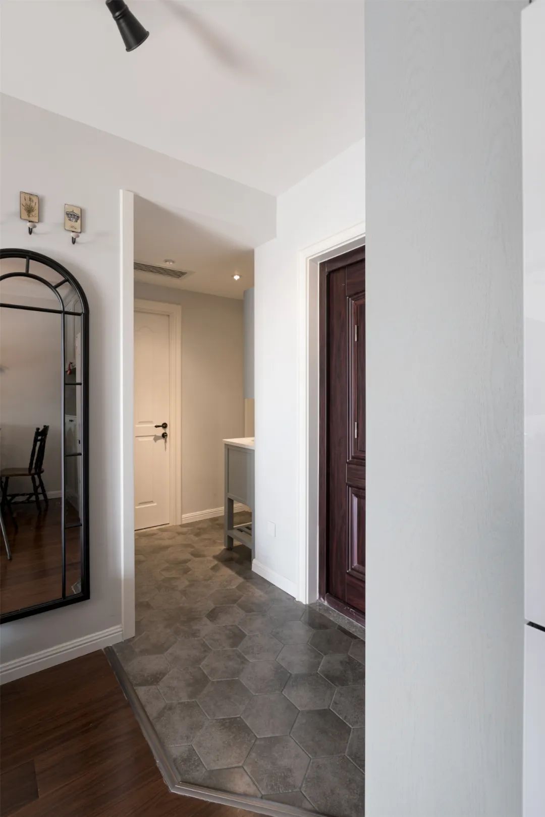 过道与玄关融为一体,地面六边砖巧妙划分,墙面全身镜便捷实用,为归家增添舒适便捷体验。