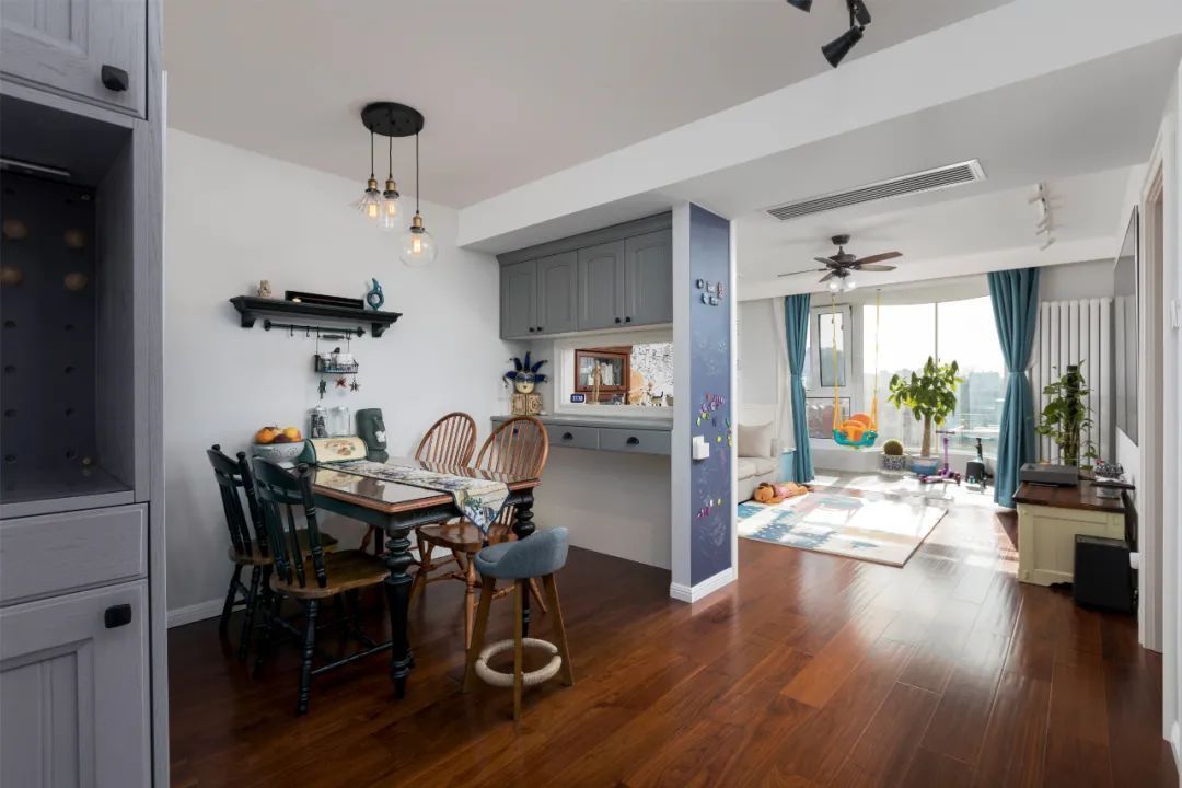 餐厅采用室内窗隔断,并以定制柜填补空间,侧边融入黑板墙设计,既增强独立性又增添情趣。定制柜的加入,使空间更加实用且舒适。